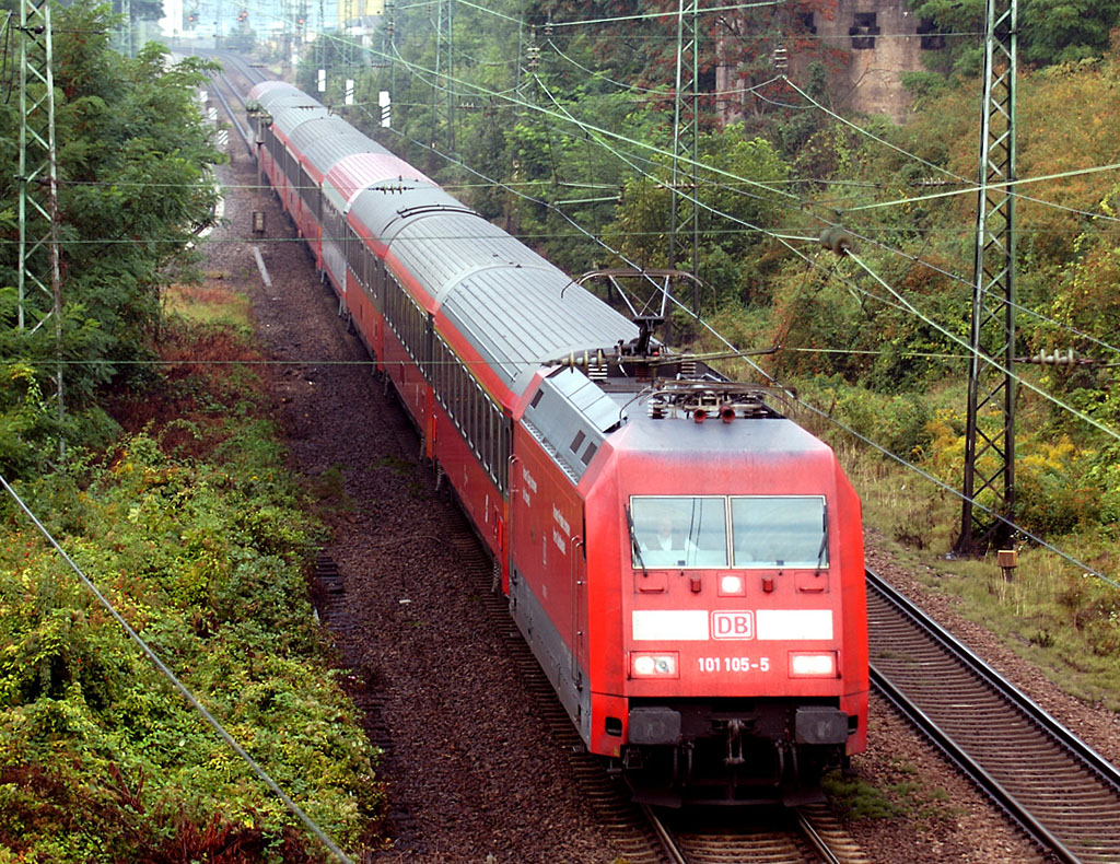 続いてBingen Hbf方向からオーストリア編成の列車がやってきてビックリ.混乱してしまいました.時刻からこれはEC115のようですが,この列車,昨年6月にはドイツIC客車で運転されていました. 101 105-5 + オーストリア客車, EC115 (Dortmund-Munich-Salzburg-Klagenfurt), Bingen Hbf-Bingen Stadt |