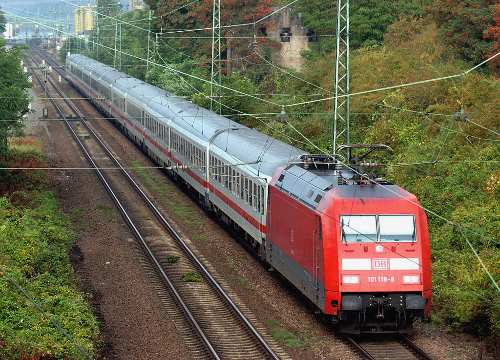 たぶん遅れのIC2614.101型の推進運転でやって来ました.時刻は9:31でおよそ25分の遅れです.ひょっとしたら後続のIC2306(Aschaffenburg Hbf -Hamburg Altona)が数分早くやってきたのかも知れません.いずれにしても機関車が編成後尾で,写真としてはうまく収まりました(笑). 101 118-8, IC2614 (Darmstadt Hbf-Koeln Hbf), Bingen Hbf-Bingen Stadt |