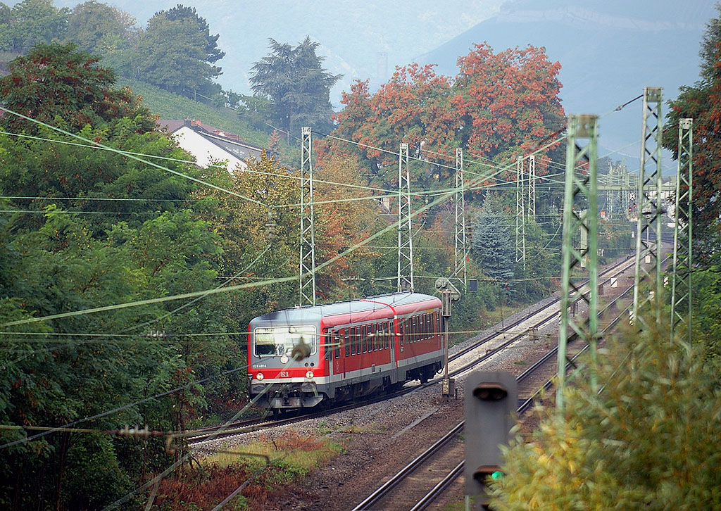 この区間には,Bingen Hbfから南に延びる支線に入る列車もやってきます.この列車は2両編成のかわいいDC.拡大すると正面窓上にMannheim