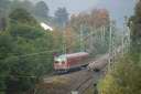 2004.10.03公開 また今年もライン渓谷にやって来ました.今回はフランクフルト空港での乗り換え間合いを利用して撮影したもので,例によってレンタカーを使い,ビンゲン〜オーバーベーゼルと,マインツ南方のニールシュタイン(Nierstein)を訪れました.当日の天気予報は午前は曇り,午後から晴れでしたので,まず午前中はライン川をあまり気にせず列車主体で撮り,午後はライン川バックの順光カットを狙うことにしました. フランクフルト空港を出たのは午前8時.これならライン左岸線に1日一往復だけ設定されている181型牽引のIC351に間に合いそうです.地図を見て”晴れれば順光”のビンゲンに狙いを定めます.3-66-643-60とアウトバーンを走り,8:45にはとあるオーバークロスに着きました.ライン川は見えませんが雰囲気はいいのでここでIC351を待つことにします.ここはBingen Stadt - Bingen Hbf間の陸橋ということのようです. |