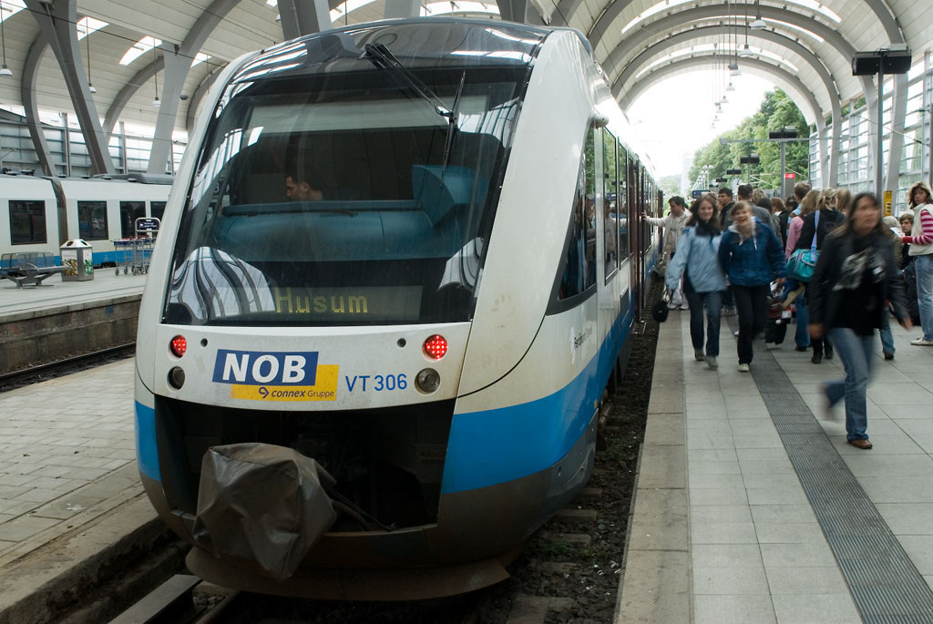 15:04 | やっと到着。漠然と機関車+客車の編成を予想していましたが、NOB(Nord-Ostsee-Bahn)のDC2連でした。北海側の町Husum行きです。 |