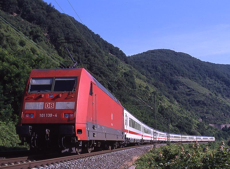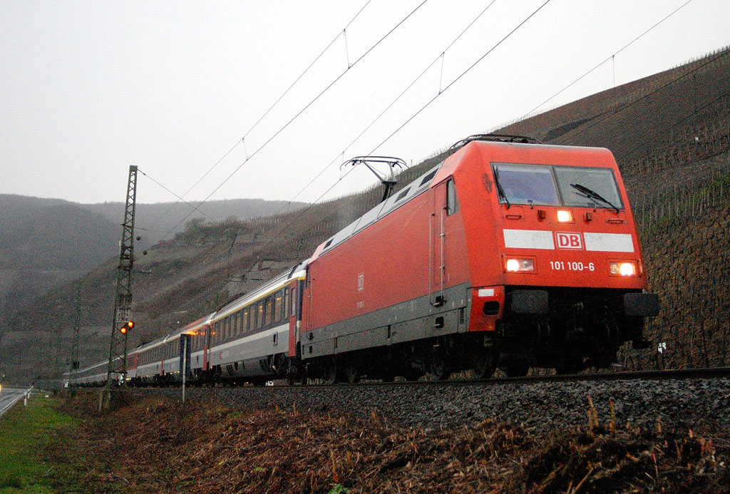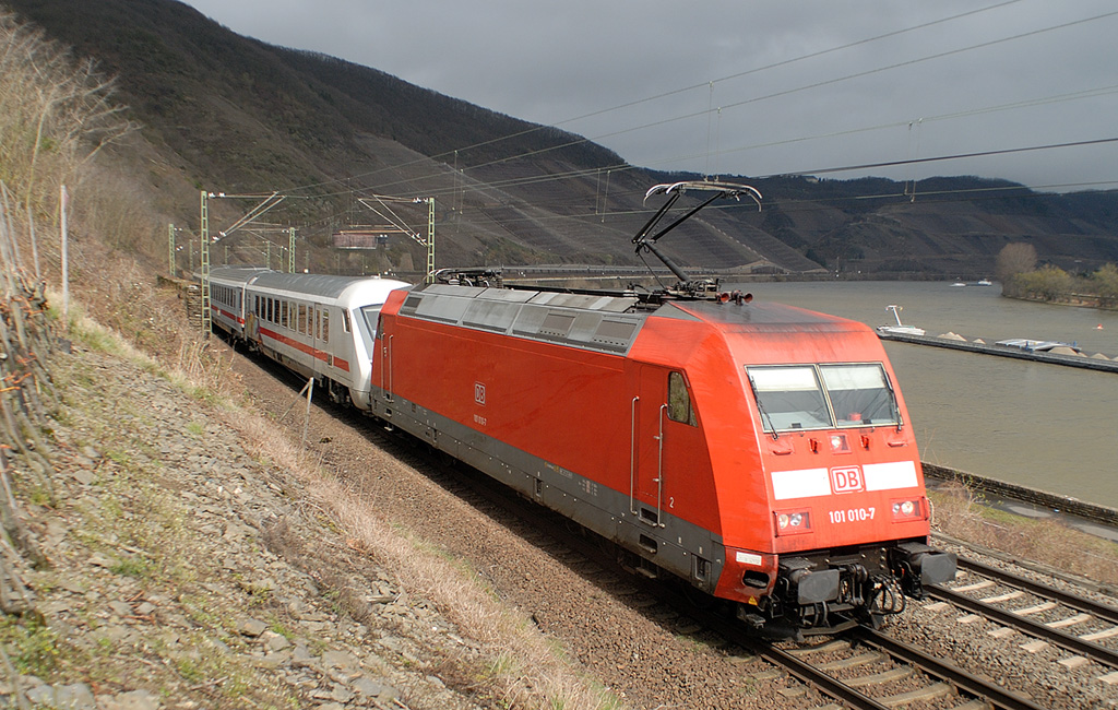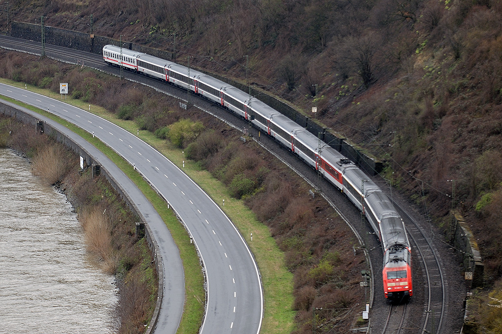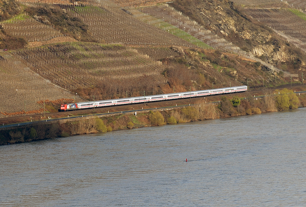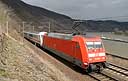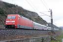 薄日が射してきました。なぜか制御客車の前に機関車を連結した編成でICがフランクフルト方向へ駆けて行きます。後尾は制御室のない客車でした。何でしょう? 101 010-7, Boppard-Spay |