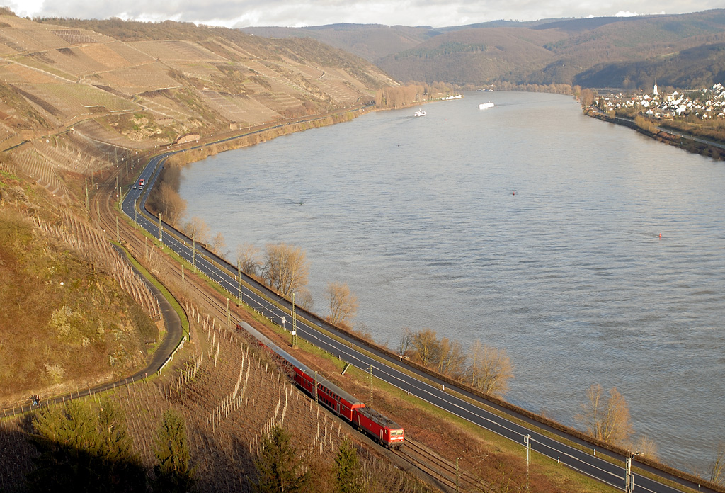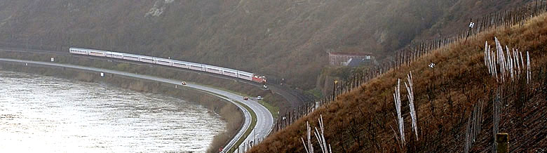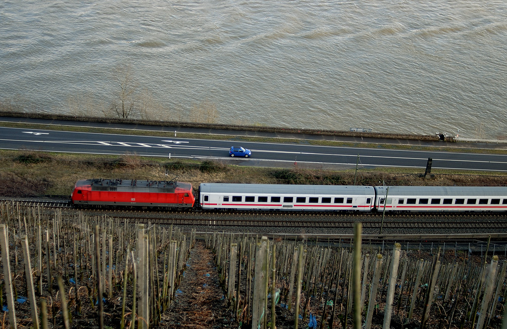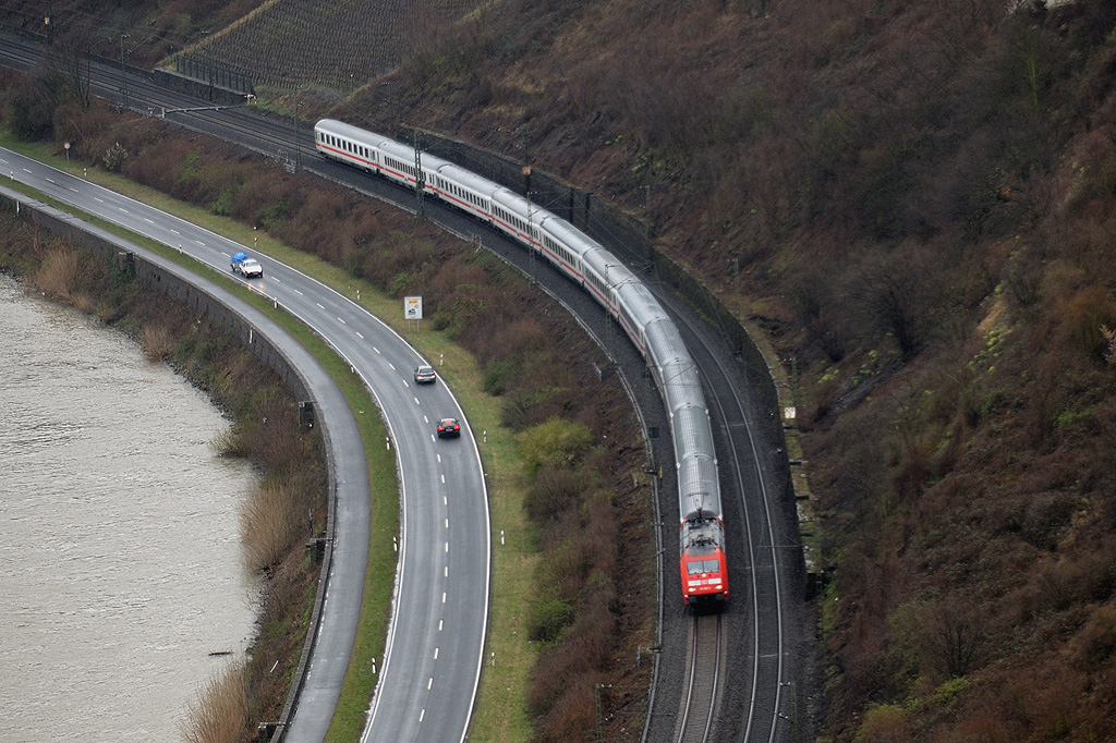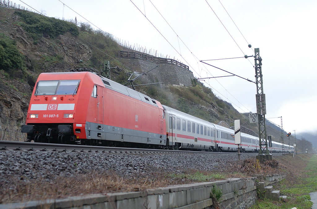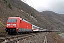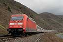 薄日が射してきました。なぜか制御客車の前に機関車を連結した編成でICがフランクフルト方向へ駆けて行きます。後尾は制御室のない客車でした。何でしょう? 101 010-7, Boppard-Spay |