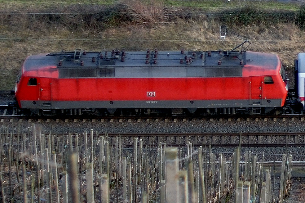 丘に登ります。晴れ、曇り、雨、霙、そして吹雪と、目まぐるしく変わる天気に春を感じつつ、4年ぶりのライン渓谷を撮り歩きました。Boppardのブドウ畑には冬を越した細い幹が斜面一面を埋め尽くしていました。雲間から薄日が射すなか、120型牽引のICが北上してきました。 120 103-7, IC2024 Frankfurt(M) Hbf → Hamburg-Altona Boppard-Spay |