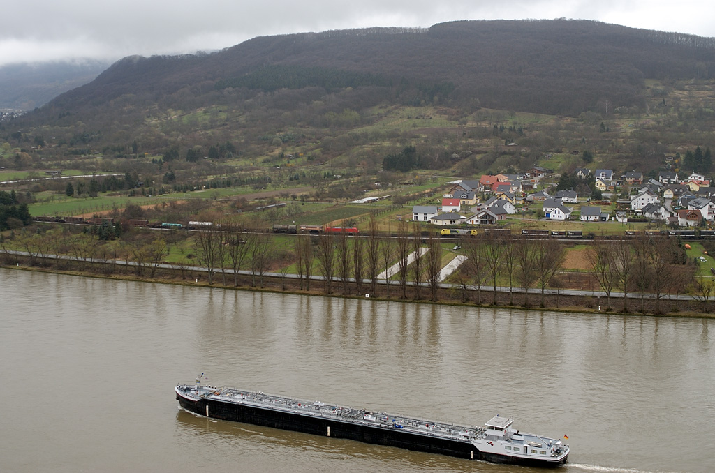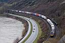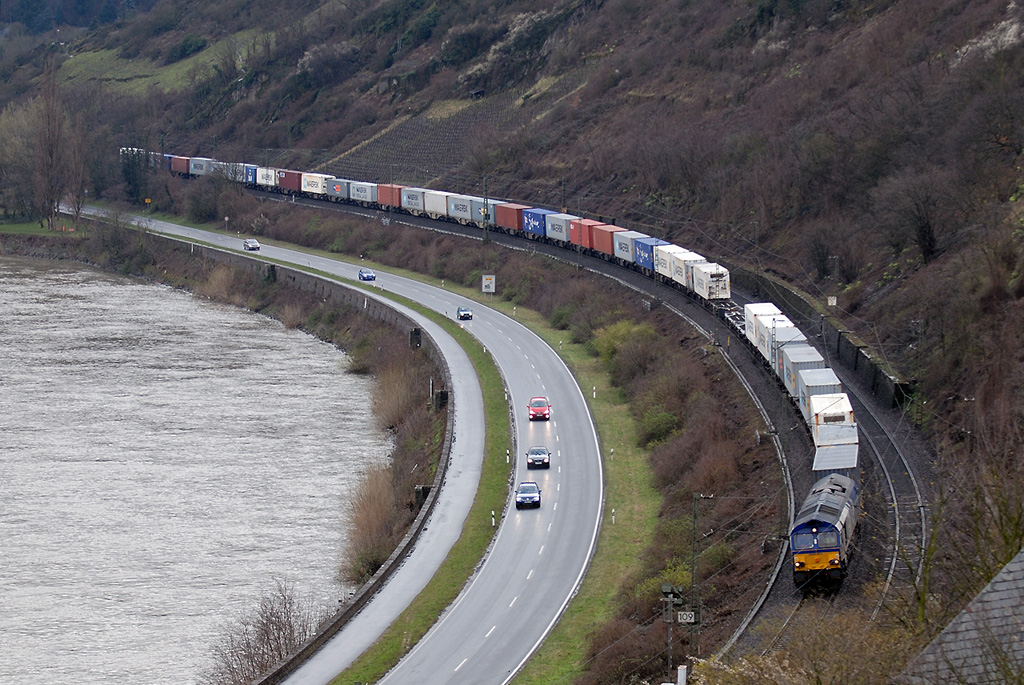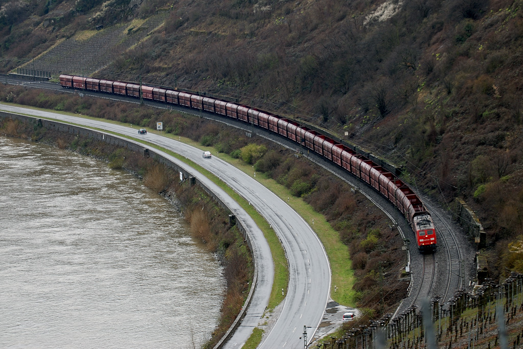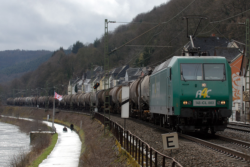 1時間半のドライブでコブレンツ側からライン左岸線に沿って南下すると、ほどなくRail4Chemの運用する145-CL 003に牽引された北行き貨物がやって来た。同機はDeutsche