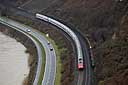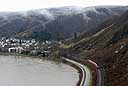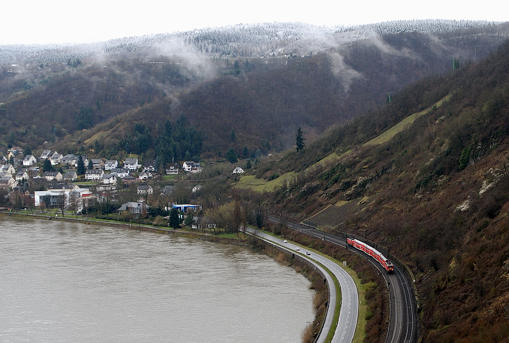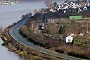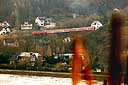 少しづつ視界が晴れてきました。対岸ののOsterspai-Filsenを望みます。左からverkehrsrot塗装のDB機が、右からDispolok機に牽かれた貨物列車が行き違います。 Osterspai-Filsen |