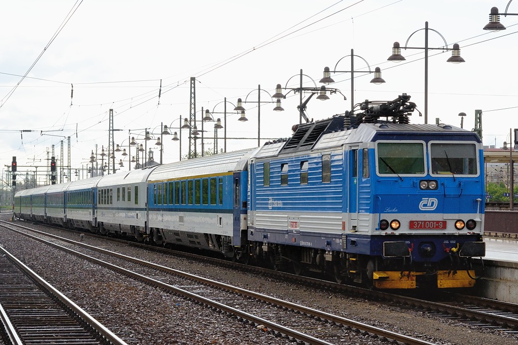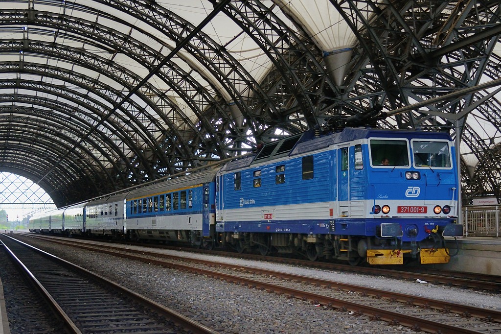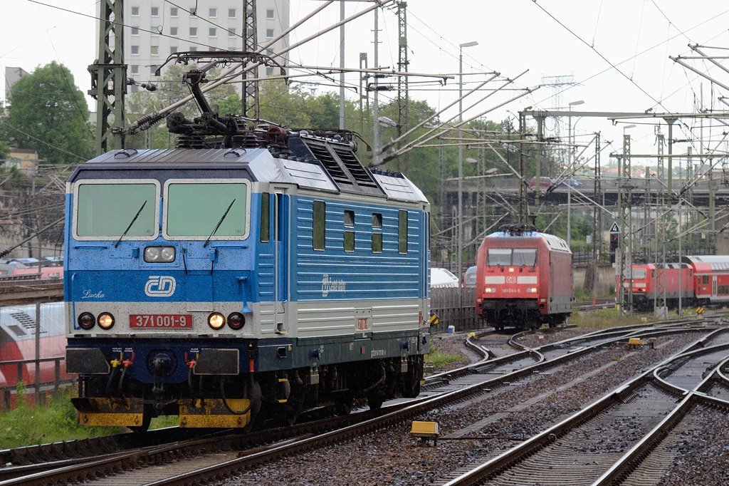 8:48、ほぼ定時で17番線に到着。牽引機はCD371型のトップナンバー371 001-9で、ブルーと白のツートンカラーが客車とよくマッチしています。